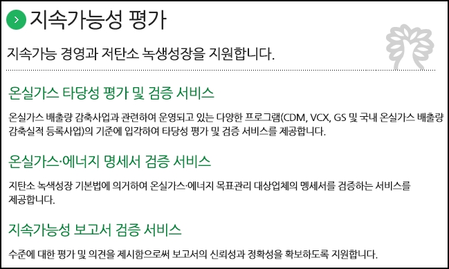 지속가능성 평가 부분에서는 지속가능 경영과 저탄소 녹색성장을 지원합니다. 온실가스 타당성 평가 및 검증 서비스를 제공하고, 온실가스 및 에너지 명세서 검증 서비스를 제공합니다. 또한 수준에 대한 평가 및 의견을 제시하여 보고서의 신뢰성과 정확성을 확보하도록 지원합니다.