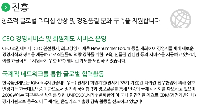 마지막으로는 진흥 부분을 보겠습니다. 창조적 글로벌 리더쉽 향상 및 경영품질 문화 구축을 지원합니다. CEO 경영서비스 및 회원제도 서비스를 운영하고, 국제적 네트워크를 통한 글로벌 협력활동을 선도하고 있습니다. 지금까지 한국품질재단에 대한 상세 안내를 확인해보았는데요, 제가 예상했던 것보다 더 많은 일들을 하고있더군요.