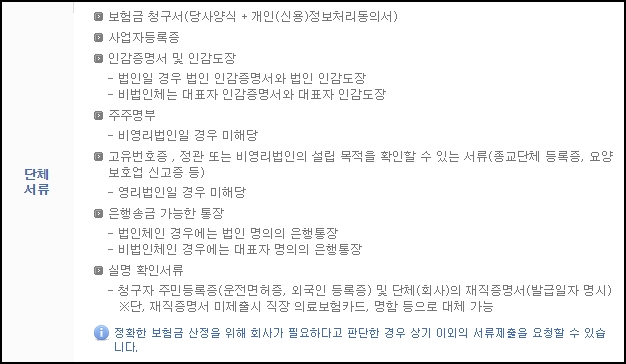 다음은 단체서류입니다. 정확한 보험금 산정을 위하여 회사가 필요하다고 판단한 경우 상기 이외의 서류제출을 요청할수도 있습니다.