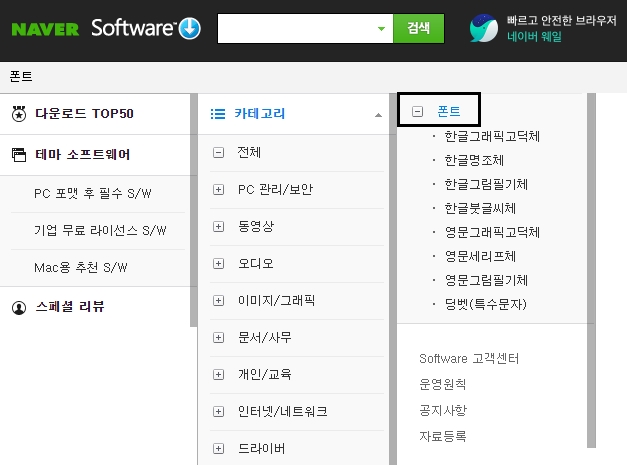 포털사이트 또는 검색엔진 등을 활용하여 검색하시면 NAVER Software 페이지 링크를 찾아서 접속할 수 있습니다. 화면 좌측에 있는 [카테고리] 메뉴를 선택해서 [폰트] 항목을 선택하여 다양한 글씨체 파일들을 만나실 수 있어요.