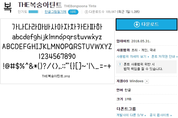 저는 THE 복숭아틴트를 선택해보았습니다. 미리보기도 제공하기때문에 서체확인을 할 수 있으며 [다운로드] 버튼을 눌러서 PC에 설치하여 사용할 수 있습니다. 사용범위는 프리웨어이지만 상세 저작권 등에 대해서 다시한번 잘 체크하시기 바랍니다. 지원하는 OS와 언어, 크기 등에 대한 정보도 확인할 수 있어요.