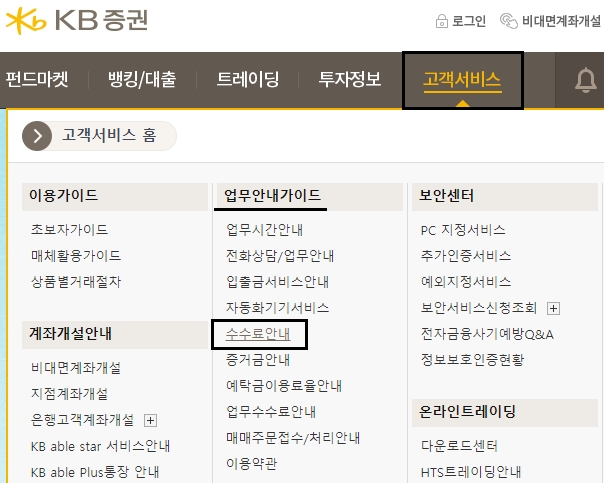 일단은 KB증권 홈페이지 주소를 찾아서 접속해야 합니다. 검색엔진 또는 포털사이트 등을 활용하여 검색하시면 바로가기를 통할 수 있는데요, 메인화면 상단 우측에 있는 [고객서비스] 메뉴를 눌러서 [업무안내가이드] 영역에 있는 [수수료안내] 항목을 선택합니다.