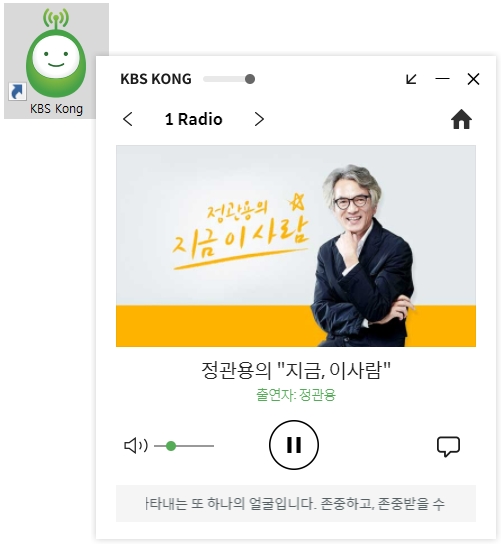 프로그램을 실행하면 위의 그림과 같은 창을 볼 수 있습니다. 현재 정관용의 지금 이사람이라는 방송이 나오고 있는데요, 원하는 채널로 변경할수도 있습니다. 말풍선을 클릭하여 채팅에도 참여할 수 있으며, 라디오 정지 및 재생버튼 그리고 음량조절을 할 수 있어요.