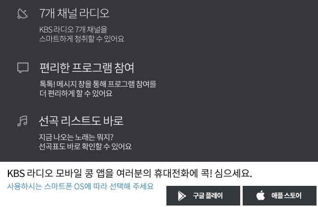 채널의 경우 총 일곱가지를 지원하고, 메시지 창을 통하여 프로그램 참여를 할 수 있습니다. 현재 흘러나오는 노래는 무엇인지 선곡표로 바로 확인할수도 있습니다.