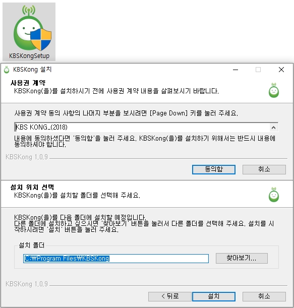 그럼 저는 PC용 KBS 콩 다운로드와 설치를 진행해보겠습니다. 셋업아이콘을 클릭하여 설치를 시작할 수 있는데요, 사용권 계약을 모두 읽어보시고 [동의함] 버튼을 누릅니다. 그리고 다음 창에서는 [찾아보기] 버튼을 눌러서 인스톨 위치를 지정할 수 있습니다.