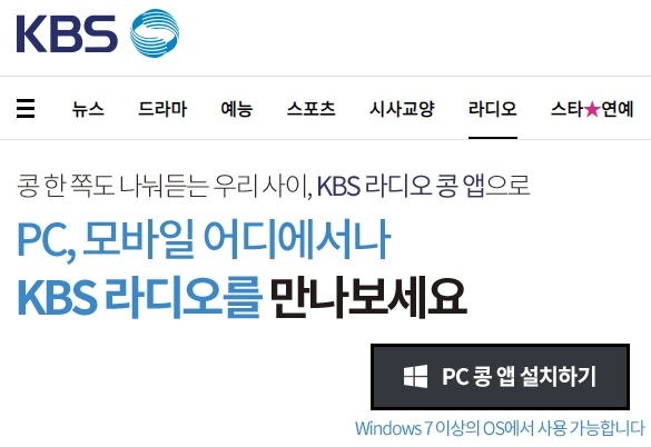 케이비에스 홈페이지 주소를 찾아서 접속한다음 [라디오] 메뉴를 선택하여 [PC 콩 앱 설치하기] 버튼을 클릭합니다. 지원하는 운영체제는 윈도우7버전 이상이며, 컴퓨터와 모바일 어디서나 KBS 라디오를 만나보실 수 있습니다. 모바일용은 어플로 다운받아 이용하시면 되는데, 좀이따가 다시 설명드리도록 하겠습니다.