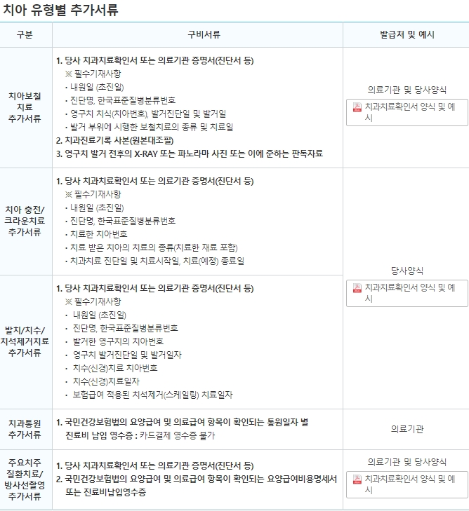 다음은 치아 유형별 추가서류를 보겠습니다. 치아보철치료, 치아충전/크라운치료, 발치/치수/치석체거치료, 치과통원, 주요치주질환치료/방사선촬영시 필요한 구비서류에 대하여 잘 정리한 표가 있으니 참조하시기 바라며 발급처 및 양식과 예시도 나와있으니 참고하시기 바랍니다.