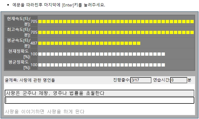 저는 문장연습 메뉴로 들어가보았습니다. 예문을 따라친 후 마지막에 엔터키를 눌러주시면 됩니다. 그러면 현재속도, 최고속도, 평균속도,