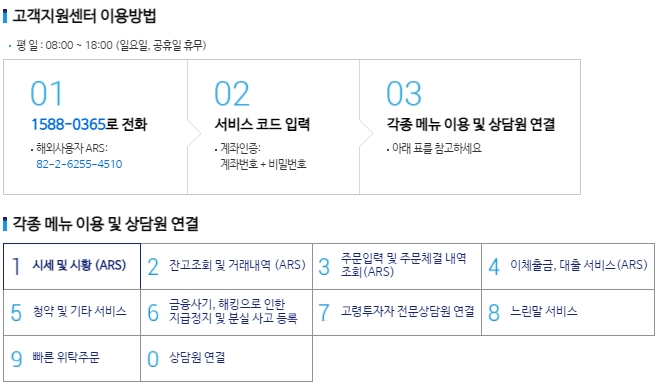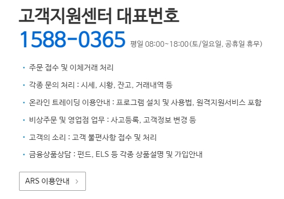 먼저 고객지원센터 대표번호를 보겠습니다. 평일 09시부터 18시까지 운영하며, 토요일과 일요일 및 공휴일은 운영하지 않습니다. 주문접수와 이체거래처리, 각종 문의처리, 온라인 트레이딩, 비상주문 및 영업점 업무, 고객의 소리, 금융상품상담을 지원합니다.