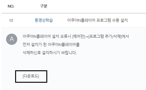 그 아래쪽에는 YBM인강이 있는데요, 세번째 탭에 있는 [동영상학습] 탭을 선택합니다. 그러면 10번에 [아쿠아N플레이어 프로그램 수동 설치] 항목이 있습니다.