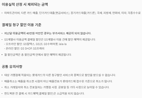 이용실적 산정시 제외되는 금액 예시도 나와있으니 참고하시구요, 지난달 이용금액이 40만원 미만인 경우에는 부가서비스 제공이 되지 않습니다. 월 할인금액은 총 할인금액 안에서 할인혜택이 제공되며, 공통 유의사항도 몇 가지가 있으니 위의 내용을 참고하시기 바랍니다.