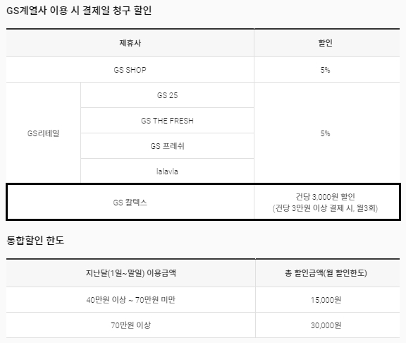GS계열사 이용시 결제일 청구할인 혜택이 있습니다. 연회비는 15000원이지만, 매월 할인혜택을 잘만 활용하면 연회의 몇 배가 되는 돈을 아낄수도 있어요.