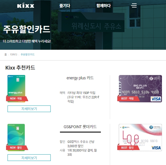 KIXX 또는 GS주유소 할인카드 중 하나를 알아보도록 하겠습니다. 제가 자주 이용하는 주유소이기도 한데요, 주유어플을 활용해서 미미하게 할인혜택을 누리고는 있지만 아예 전용 카드를 발급받아서 더 많은 할인을 받을수도 있습니다. 우선은 KIXX 홈페이지 주소를 찾아서 접속해보겠습니다.