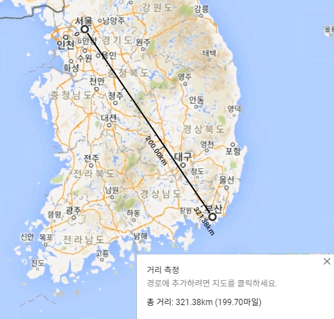 거리를 측정하고자 하는 위치에다가 마우스 커서를 올려놓고 우클릭을 합니다. 그리고 생성되는 메뉴들 중에서 가장 하단에 있는 [거리 측정] 항목을 눌러주세요. 저는 서울에서부터 부산까지의 직선거리를 측정해보았습니다.