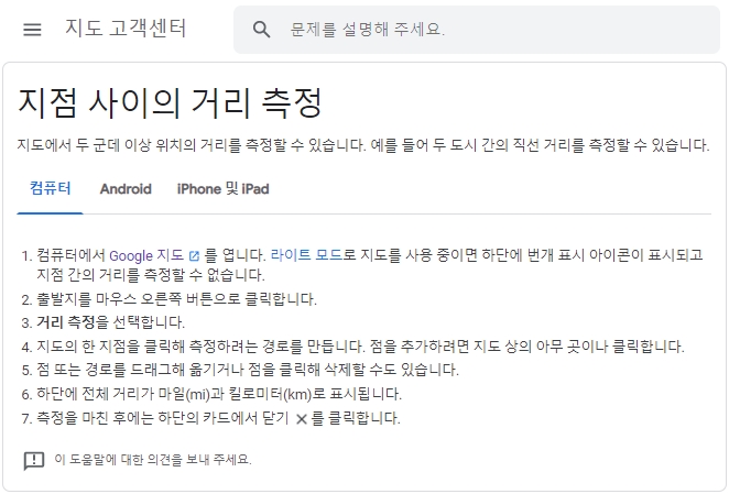 구글지도 고객센터 페이지에 접속하여 지점 사이의 거리를 측정하는 방법부터 보도록 하겠습니다. 지도에서 두 군데 이상 위치의 거리를 측정할 수 있으며, 두 도시간의 직선거리를 측정할 수 있습니다. 컴퓨터, 안드로이드, 아이폰 및 아이패드를 기준으로 모두 설명되어 있으니 참고하시면 됩니다.