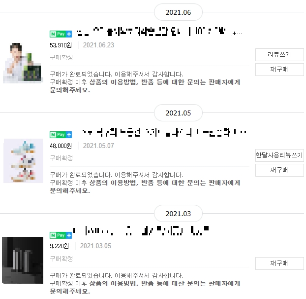 최근에 결제한 내역을 시간순으로 조회해보았는데요, 지난 6월과 5월 그리고 3월에 구매했던 내역이 있네요. 건강식품이랑 신발이랑 휴지통을 샀었는데 가격대비 나름 만족하고 있습니다. 구매확정 이후 상품의 이용방법이나 반품 등에 대한 문의는 판매자에게 하시면 됩니다.