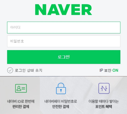 네이버 아이디와 비밀번호를 입력하여 로그인 할 수 있습니다. 로그인 상태를 유지하거나 IP 보안 상태를 확인할 수 있어요. 네이버 ID로 한번에
