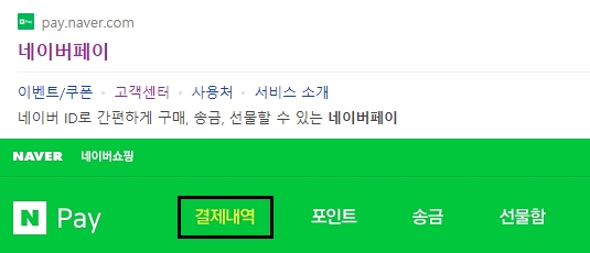 저도 해당 서비스를 활용하여 결제를 해본적이 여러번 있는데요, 오늘은 네이버페이 결제내역 조회해보는 방법을 준비해보았습니다. 네이버페이 홈페이지에 접속하셔서 메인화면 상단에 있는 [결제내역] 메뉴를 선택합니다.