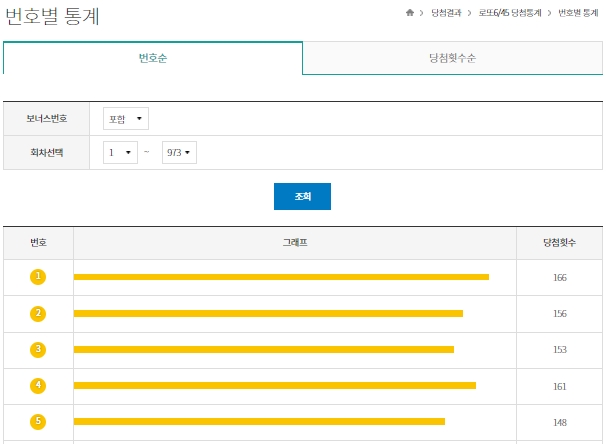 그럼 번호별 통계를 보도록 하겠습니다. 번호순과 당첨횟수순으로 기준을 잡을 수 있는데요, 먼저 번호순입니다. 보너스번호 포함여부를 설정할 수 있고, 회차구간을 선택할 수 있습니다. [조회] 버튼을 눌러서 1번부터 45번까지 당첨번호에 몇 번이나 등장했는지 확인이 가능합니다.