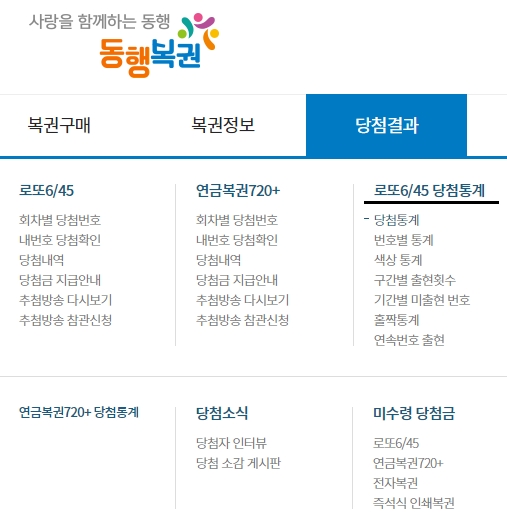 오늘은 로또 자주나오는 번호 또는 로또당첨번호 통계를 확인해보는 방법을 준비해보았습니다. 동행복권 홈페이지에 접속하여 여러가지 통계들을 확인할 수 있는데요, 메인화면 상단에 있는 [당첨결과] 메뉴를 선택하고 [로또6/45 당첨통계] 항목을 선택합니다. 크게 여섯가지 기준으로 데이터를 제공하고 있는데, 각각에 대한 설명을 보겠습니다.
