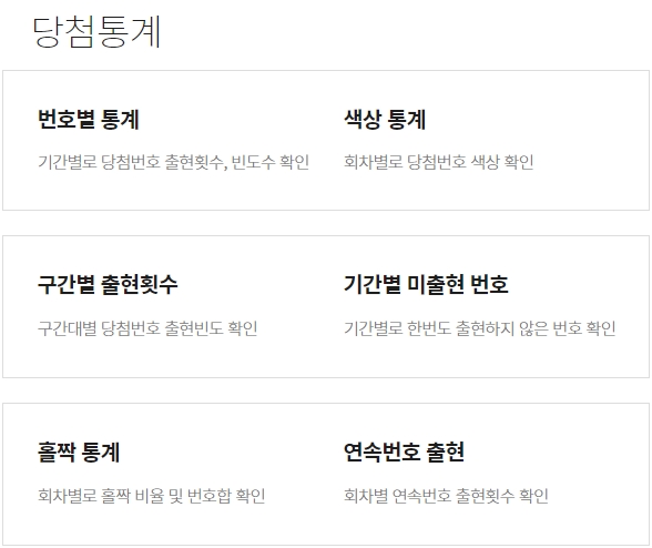 번호별 통계는 기간별로 당첨번호 출현횟수와 빈도수를 제공합니다. 색상 통계로는 회차별로 당첨번호 색상을 확인할 수 있어요. 구간별 출현횟수는 구간대별 당첨번호 출현빈도 확인이 가능하고,
