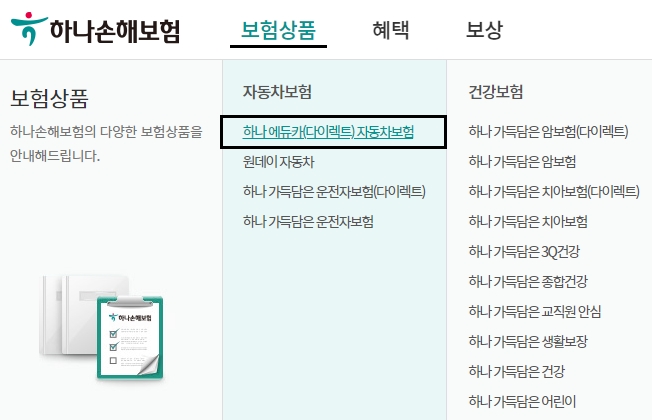 이번시간에는 하나손해보험 다이렉트 자동차보험 또는 하나 에듀카 자동차보험 상품에 대해서 살펴보려고 합니다. 해당 보험사 홈페이지는 포털 또는 검색엔진 등을 활용하여 접속할 수 있으며, 메인화면 상단에 있는 [보험상품] 메뉴를 선택하여 [자동차보험] 영역에서 해당 상품을 찾을 수 있습니다.