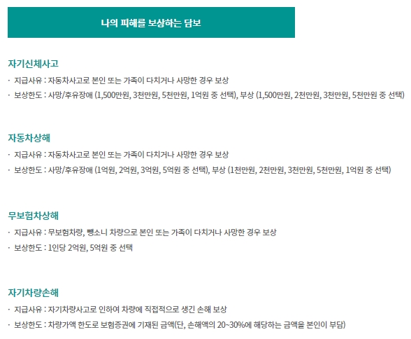 다음은 나의 피해를 보상하는 담보를 보겠습니다. 자기신체사고와 자동차상해는 자동차사고로 본인 또는 가족이 다치거나 사망한 경우에 보상하며, 보상한도에 차이가 있습니다. 무보험차상해는 무보험차량이나 뺑소니 차량으로 본인 또는 가족이 다치거나 사망한 경우에 보상합니다. 자기차량손해는 자기차량사고로 인하여 차량에 직접적으로 생긴 손해를 보상합니다.