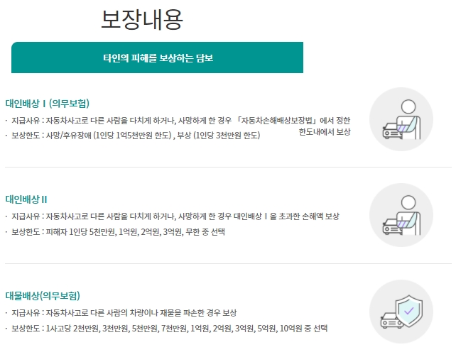 보장내용을 보도록 하겠습니다. 먼저 타인의 피해를 보상하는 담보입니다. 대인배상1은 의무보험이며, 자동차사고로 다른 사람을 다치게 하거나 사망하게 한 경우 자동차손해배상보장법에서 정한 한도내에서 보상합니다.