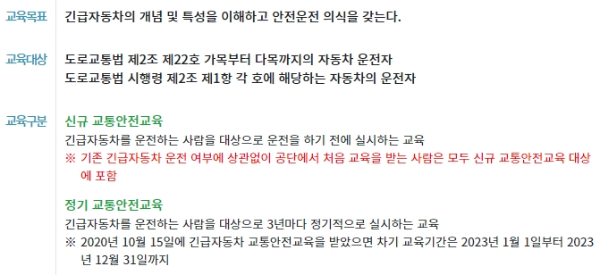 교육목표는 긴급자동차의 개념 및 특성을 이해하고 안전운전 의식을 갖는 것입니다. 교육대상은 도로교통법 제2조 제22호 가목부터 다목까지의 자동차 운전자와 도로교통법 시행령 제2조 제1항 각 호에 해당하는 자동차의 운전자입니다. 교육구분은 신규와 정기 교통안전교육이 있습니다.