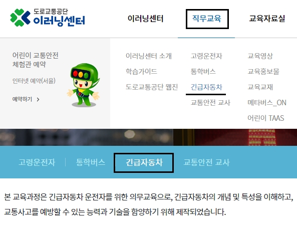 홈페이지에 접속하셔서 메인화면 상단에 있는 [직무교육] 메뉴를 선택합니다. 하위항목들 중에서는 [긴급자동차] 항목을 선택하시면 되는데요, 고령운전자나 통학버스 및 교통안전 교사 교육도 있습니다.