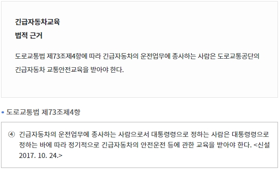 해당 교육을 받아야 하는 법적인 근거가 있는데요, 도로교통법 제73조 제4항에 따라 긴급자동차의 운전업무에 종사하는 사람은 도로교통공단의 긴급자동차 교통안전교육을 받아야 합니다.