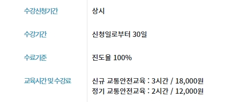 신규는 긴급자동차를 운전하는 사람을 대상으로 운전을 하기전에 실시하는 교육이고, 정기는 3년마다 정기적으로 실시하는 교육입니다. 수강신청기간은 상시이고, 수강기간은 신청일로부터 30일입니다. 수료기준은 진도율 100%이고, 교육시간 및 수강료는 위의 내용과 같습니다. 신규는 3시간에 18000원이고, 정기는 2시간에 12000원입니다.