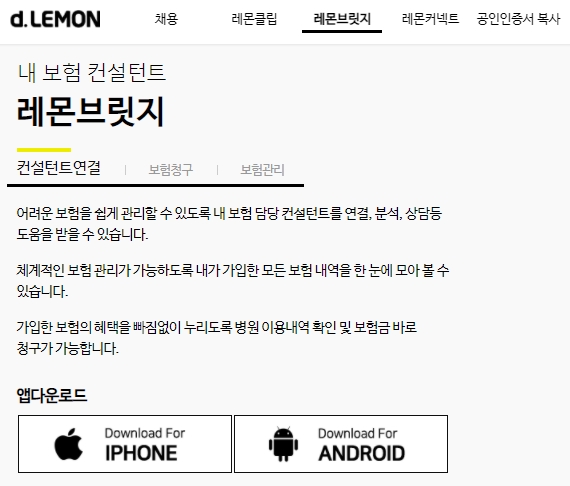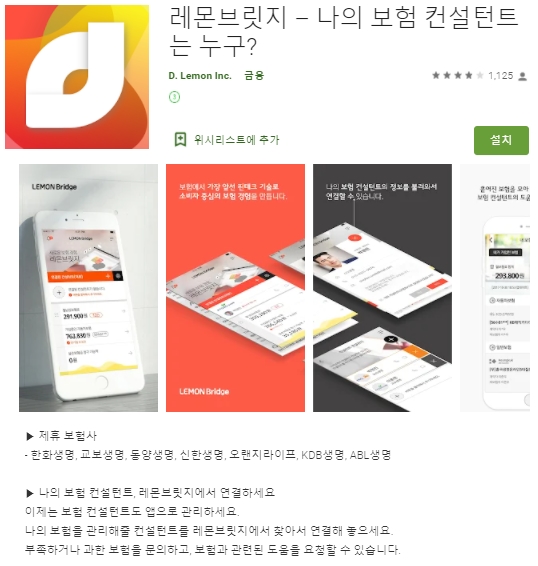 d.LEMON에서 제공하는 레몬브릿지라는 보험 컨설턴트 어플리케이션에 대하여 알아보겠습니다. 저도 예전에 깔았던 적이 있는 앱인데요, 보험과 관련하여 여러가지 정보들을 얻을 수 있습니다. 어려운 보험을 쉽게 관리할 수 있도록 내 보험 담당 컨설턴트를 연결, 분석, 상담 등의 도움을 받을 수 있어요.