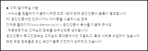 서비스를 원활히 이용하기 위해서는 최초 1회에 한하여 공동인증서 등록이 필요하며, PC 공동인증서만 있거나 아이폰을 사용하는 경우에는 디레몬 홈페이지에서 공동인증서 복사를 해주세요. 로그인정보는 고객의 휴대폰에서만 구동되고, 특정 서버로 수집하지 않으며, 모든 정보들은 최신 보안기술로 안전히 관리하고 있습니다.