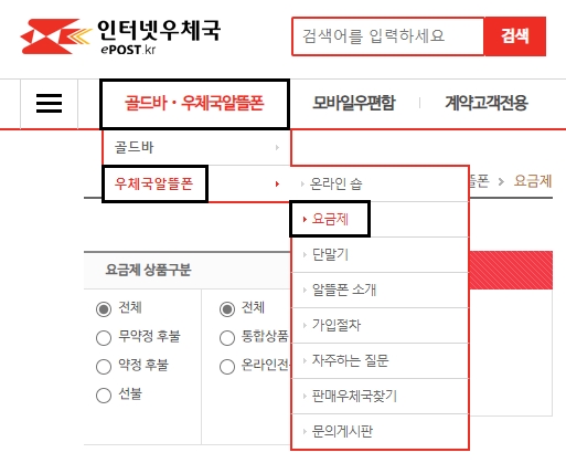 오늘은 여러가지 우체국 알뜰폰 요금제 중에서 Well 미니 요금제에 대하여 알아보려고 합니다. 인터넷 우체국 홈페이지에 접속해서 메인화면 상단에 있는 [골드바/우체국알뜰폰] 메뉴를 선택합니다. 그리고 [우체국알뜰폰] 영역의 [요금제] 항목을 눌러주시면 되겠습니다.