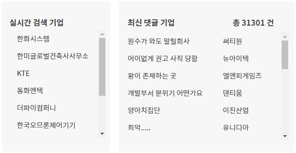 메인화면에서는 실시간 검색 기업의 종류를 확인할 수 있고, 최신 댓글 기업도 확인할 수 있습니다. 실제 근무했던 사람들의 의견도 볼 수 있기때문에 좋은 참고가 될 수 있습니다.