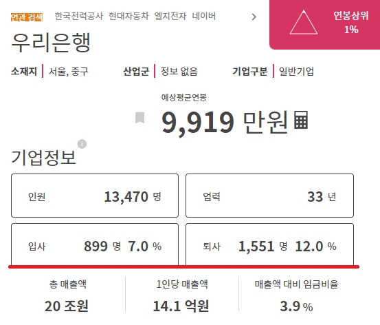 우리은행의 예상평균연봉은 9,919만원입니다. 거의 1억에 가까운 금액인데요, 물론 모든 직원들이 저만큼을 받는것은 아니지만 그래도 상위 1%에 속하는 연봉이라고 하네요. 인원은 13,470명이고 업력은 33년입니다. 입사는 899명, 퇴사는 1551명으로 나오네요. 총 매출액은 20조원이고, 1인당 매출액은 14.1원이며, 매출액 대비 임금비율은 3.9%입니다.