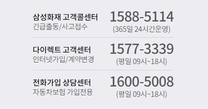 더 궁금한 사항이 있다면 고객센터로 연락하여 문의해보세요. 긴급출동, 사고접수, 인터넷가입, 계약변경, 자동차보험 가입전용 전화번호가 있으며 운영시간은 위의 그림을 참고하시면 됩니다.