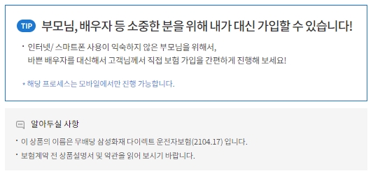 부모님이나 배우자 등 소중한 사람을 위하여 대신 가입할 수 있는데요, 인터넷이나 스마트폰 사용이 익숙하지 않은 부모님이나 바쁜 배우자를 대신해서 고객이 직접 보험가입을 간편하게 진행할 수 있습니다. 다만 해당 프로세스는 모바일에서만 진행이 가능합니다. 무배당 삼성화재 다이렉트 운전자보험에 가입하기 전에 상품설명서와 약관을 잘 읽어보시기 바랍니다.