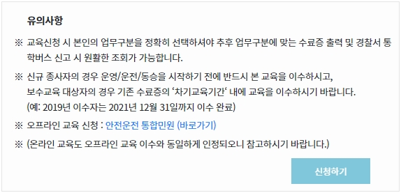마지막으로는 유의사항을 보겠습니다. 교육신청을 할 때 본인의 업무구분을 명확히 선택해야 추후 업무구분에 맞는 수료증을 출력할 수 있고, 통학버스 신고시 원활하게 조회할 수 있습니다. 신규 종사자는 운영, 운전, 동승 시작전에 반드시 본 교육을 이수해주시고 보수교육 대상자는 기존 수료증의 차기교육기간내에 교육을 이수하시기 바랍니다.
