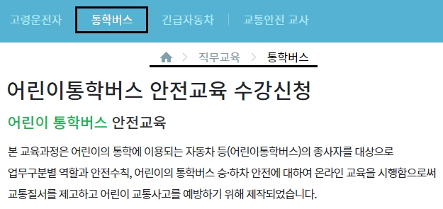 어린이 통학버스 안전교육 수강신청에 대한 내용을 보겠습니다. 본 교육과정은 어린이 통학에 이용되는 자동차 등의 종사자를 대상으로 하며 업무구분별 역할과 안전수칙 및 어린이의 통학버스 승/하차 안전에 대해서 온라인 교육을 시행하고, 그에따라 교통질서 제고 및 어린이 교통사고를 예방하기 위하여 제작되었습니다.