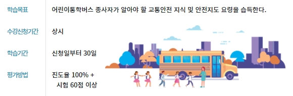학습목표와 수강신청기간, 학습기간, 평가방법에 대해서는 아래를 참고하시면 됩니다. 어린이 통학버스 종사자가 알아야 할 교통안전 지식과 안전지도 요령을 습득하는 것이 목표이고,