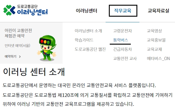 어린이 통학버스 교육 또는 도로교통공단 동승자교육에 대한 안내를 보겠습니다. 해당 사이트에 접속하여 메인화면 상단의 [직무교육] 메뉴를 선택하고 [통학버스] 항목을 눌러줍니다. 이러닝센터는 도로교통공단에서 운영하는 대국민 온라인 교통안전교육 서비스 플랫폼이며, 교통질서를 확립하고 교통안전에 기여하기 위하여 이러닝 기반의 교통안전 교육프로그램을 제공하고 있어요.
