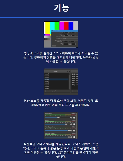 윈도우와 맥 그리고 리눅스를 지원하며, 영상 녹화와 실시간 방송을 할 수 있는 무료 및 공개 소프트웨어입니다. 보통은 윈도우용을 선택하여 다운받아 사용하시는 분들이 많을거라고 생각되네요. 그럼 기능에 대한 안내도 드리도록 하겠습니다. 영상과 소리를 실시간으로 포착하여 빠르게 처리할 수 있으며, 무한정의 장면을 매끄럽게 바꿔가며 녹화와 방송에 사용할 수 있습니다.