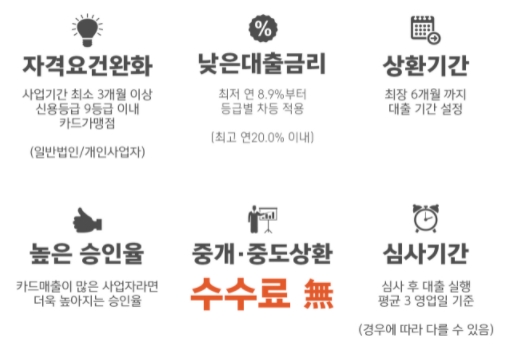 차등 적용되고, 연 최고 20% 이내입니다. 카드매출이 많은 사업자일수록 승인율이 더욱 높아지고, 중개수수료나 중도상환수수료가 없습니다.