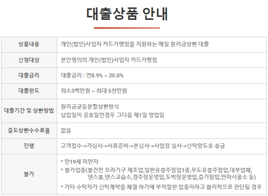 상환기간은 최장 6개월까지 설정할 수 있고, 심사기간은 심사 후 대출실행까지 평균 3영업일이 걸리며 경우에 따라서 다를 수 있습니다. 개인이나 법인사업자 카드가맹점을 지원하는 매일 원리금상환 대출로써, 본인명의의 개인이나 법인사업자 카드가맹점을 대상으로 합니다.
