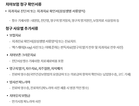 청구 사유별 추가서류는 보철치료, 치아보존 크라운치료, 영구치발거, 치수치료, 치주질환, 치석제거, 방사선파노라마, 치아유지보험금으로 구분되어 있으며 각각에 대한 상세내용은 위의 그림을 참고하시기 바랍니다.