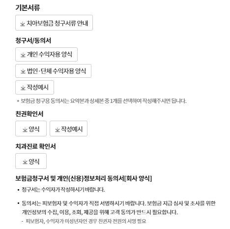 보험금 청구 사유별 접수방법과 서류안내를 확인해볼 수 있으며 [치아보험금] 탭을 선택하여 기본서류와 추가서류를 안내받을 수 있습니다. 보험금 청구용 동의서는 요약본과 상세본중 한개를 선택하여 작성할 수 있으며, 청구서는 수익자가 작성해주셔야 합니다.