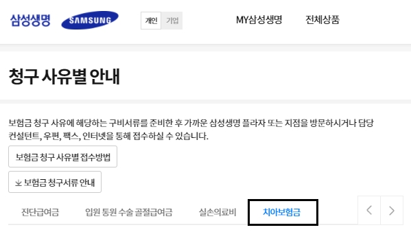 청구사유별 안내 페이지에 접속해서 삼성생명 치아보험 청구서류에 대하여 살펴보겠습니다. 보험금 청구 사유에 해당하는 구비서류를 준비하여 가까운 삼성생명 플라자나 지점을 방문하여 담당자 컨설턴트, 우편, 팩스, 인터넷을 통해서 접수할 수 있습니다.