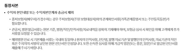 통장사본은 수익자 본인내방이나 수익자본인계좌 송금시 제외입니다. 종피보험자가 접수하는 경우 주피보험자와의 관계확인서류가 필요하며 관공서, 병원발급서류는 원본기준, 병원/직인/인적사항/치료내역을 정확히 기재해야 하며 보험금 심사시 확인을 위하여 고객에게 추가서류를 요청할 수 있습니다.